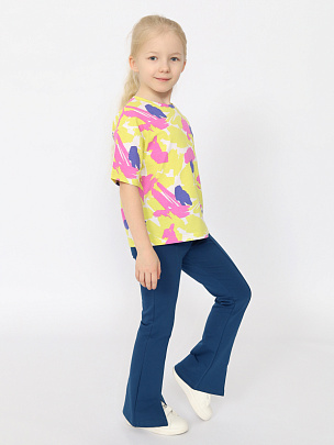 Трикотажная футболка оверсайз для девочки, выполненная из мягкого набивного трикотажа. Свободный силуэт с заниженной линией плеча не сковывает движения. Модель дополнена круглым вырезом горловины и короткими рукавами.