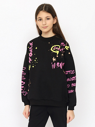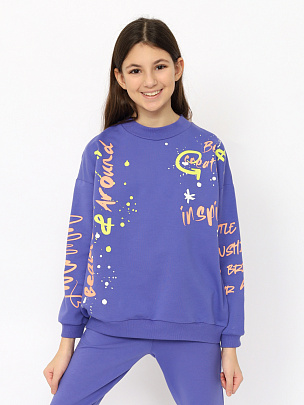 Джемпер для девочки с модным, трендовым принтом в стиле граффити (надпись: "Мой прекрасный цветок"). Крой оверсайз с заниженной линией плеча не сковывает движения, позволяя ребенку быть активным. Модель дополнена круглым вырезом горловины и длинными рукавами. Воротник, манжеты и пояс выполнены из полотна с эластаном.